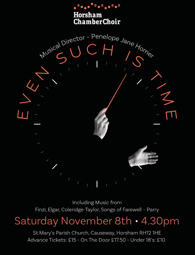 The Horsham Chamber Choir will be providing an evening of moving and profound musical reflection at St Mary’s Church in the Causeway in Horsham on Saturday, 8th November. “Even Such Is Time”—a concert exploring themes of youth, love, loss, and spiritual longing — is a carefully woven tapestry of choral works spanning five centuries.